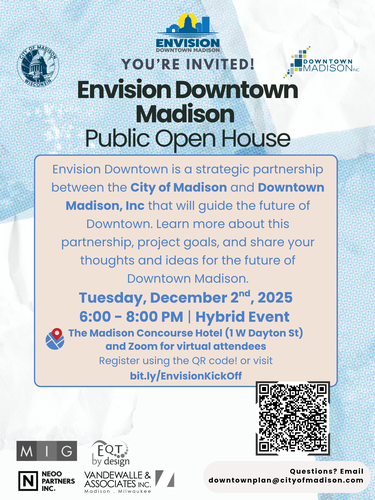 The City of Madison and DMI, along with the consultant team at Vandewalle & Associates, Equity by Design, and NEOO Partners, invite the public to attend and learn more about this partnership, project goals, and share their thoughts and ideas for the future of Downtown Madison.